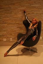 using ![]() (click image for QTversion)(wmv version) Lucy and Renee really should take this comedy routine of theirs on the road. They are such clowns with each other as you can see from the still photo from the videoclip of "What'd I Say" below. Renee is really having a good time with her cameo go-go dancer spots. But after the second night, she was aching in spots she didn't even know existed. So she was warming up when I walked into the dressing room before the show on Saturday. She was doing a backbend onto the chair behind her. To say the least, that woman is flexible! Check out "I'll Stand By You" on the Lucy Lawless Fan Club page.