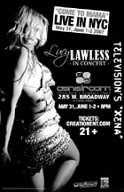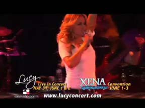 Lucy's been talking about the new outfit Alek Adorian made for her for the Canal concert and here it is! You should have seen the faces of the people walking by. It was great fun! More pics on the Official Lucy Lawless Fan Club page. Lucy's still in her Tina mode thinking "What's Love Got To Do With It?" Check out the Official Lucy Lawless Fan Club page for"Shakey Ground." It's off to NYC we go tomorrow. The band will be meeting for the first time. I'm heading for the Canal Room to check out where all the parts go. We're doing another 3-camera shoot for the dvd of the concert. Can't wait to get back to my old stomping grounds. ![]() (wmv version) I think Lucy's got a thing for TinaTurner. Michael began playing "River Deep, Mountain High"and Lucy started to fly! If this song doesn't make the Canal show, it's got to be in the next one. Checkout the Official Lucy Lawless Fan Club page for "To Sir With Love." ![]() (wmv version) Lucy and Michael Orland have been hard at work finding new songs for the Canal Room concert. They even turned to the computer looking for artists they like and lists of their hits. Cyndi Lauper's "True Colors" seemed fitting as it speaks to those who don't seem to quite fit in. Have you tried to explain to your family why you're flying across the ocean to hear Lucy sing? <G> (click image for QT version) Check out the Official Lucy Lawless Fan Club page for more clips and more songs. ![]() (wmv version) There's going to be a TV ad for Lucy's NY Canal Room concert and the NYconvention with Lucy and Renee running on Xena on the Oxygen channel May 23 and May 24, 7-8 AM ET/PT time. Here's the commercial (click image for QT). Now I want to see everyone get up early and watch it run on the show! And if you're wandering around the city, you may see this black and white poster hanging hither and yon. ![]() (wmv version)