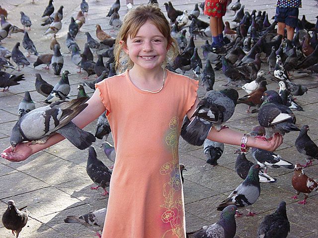 Molly faces the Attack of the Pigeons in a local town square