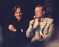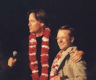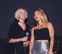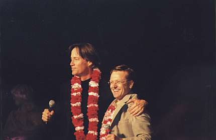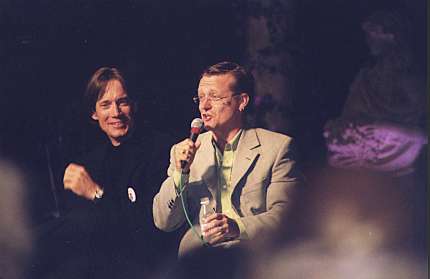 | For many fans the most dramatic (and also tearful) moment of the weekend was the appearance of Kevin Sorbo and Michael Hurst on stage together. Their very first in the United States, loyal Hercules fans had come from all over the world to witness this moment: a thank you from both sides of the stage for the great work on the recently ending series. The affection these guys have for each other is indeed endearing. We spent a long time preparing a music video that we planned to show for the first time during their mutual appearance. We wanted to show memories of the past half decade and sum up how the audience felt about the two stars. When the lights dimmed and the video ran, we knew that our goal had been accomplished since many of the audience members, and both stars, had tears in their eyes. It was a great moment! | ||