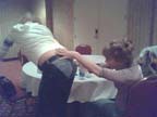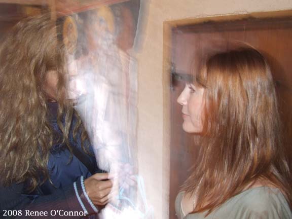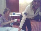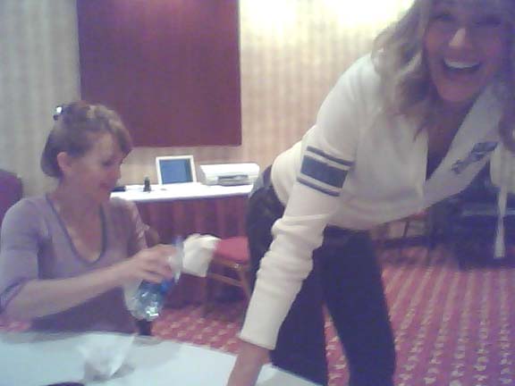 Back to the car -- and Lucy's mishap with her compact case.  You know, those round things that hold powder and shoot out of the holder every now and then.  Lucy opened it in the car and it shot out covering her lovely chaps -- front and back!  You can hear Lucy tell the story of how Renee came to the rescue and, um, er, wiped up the powder.  Luckily, there was someone in the room with a cell phone to record this good deed.